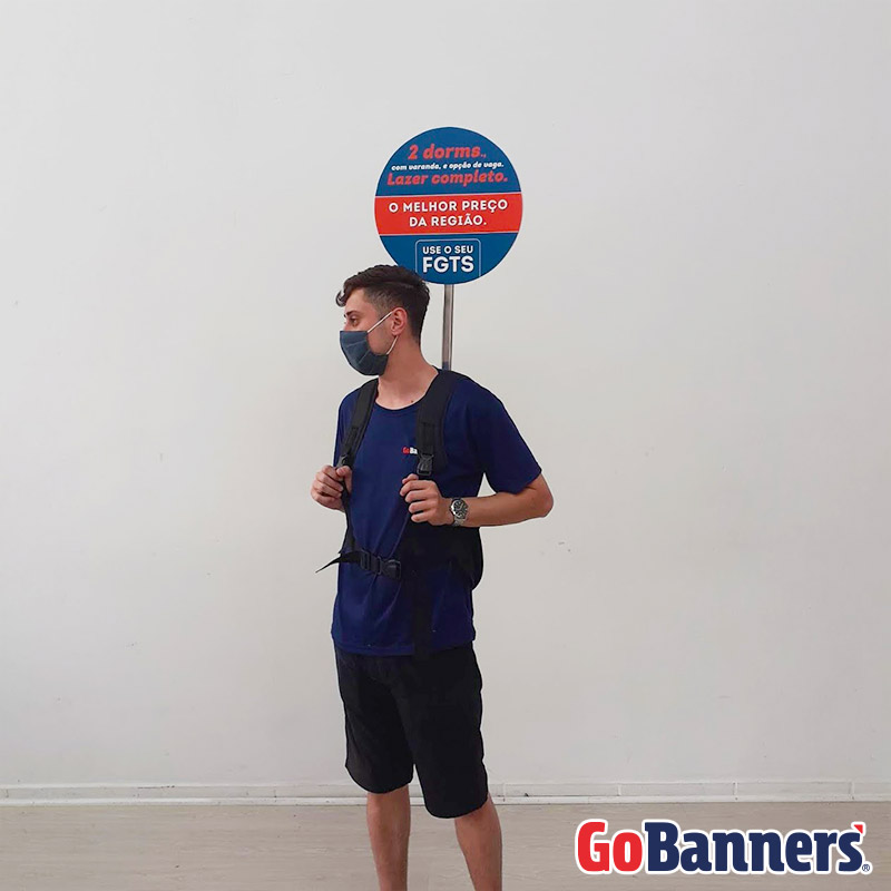 Essas mochilas chamativas, que possuem banners acima da altura do público, permitem que a marca se destaque em diferentes áreas do evento, além do espaço do stand.