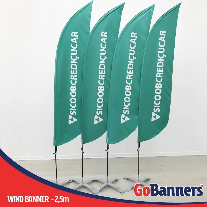Os wind banners são bandeiras verticais impressas em tecido de alta resistência, fixadas em mastros flexíveis que permitem movimento com o vento. Esse movimento natural faz com que a bandeira chame atenção com facilidade, aumentando ainda mais a visibilidade da marca no ambiente.