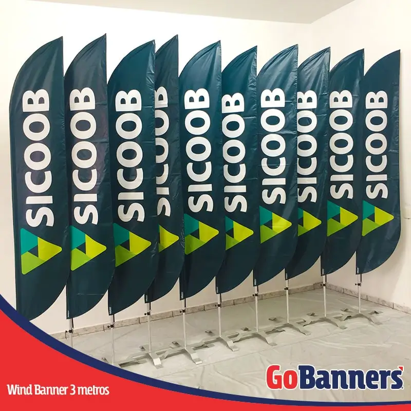 Além dos infláveis promocionais, o Sicoob também utiliza wind banners personalizados da GoBanners para reforçar sua presença visual em eventos, feiras e campanhas promocionais.