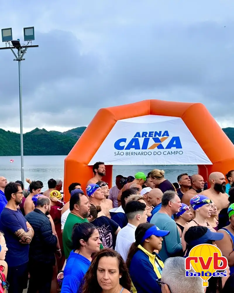 Imagina um portal inflável gigante com o logo da CAIXA em uma corrida de rua com milhares de participantes. Ele funciona como um farol, direcionando o olhar do público e criando um ponto de referência inconfundível. Isso garante que a marca seja notada, independentemente da aglomeração.