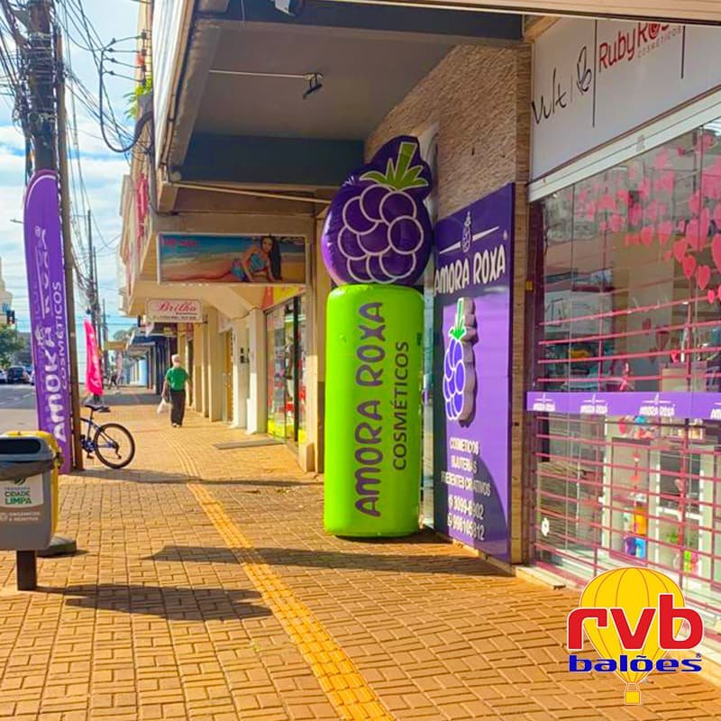 O segredo está na personalização: infláveis com o nome da loja, logo ou slogan aproximam o visitante da sua marca já nos primeiros segundos.