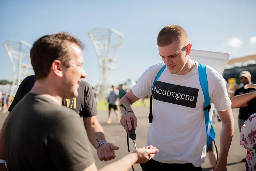 Para promover o protetor solar Neutrogena Sun Fresh durante o festival de música Primavera Sound, em São Paulo, a marca espalhou promotores de eventos para distribuir e aplicar os protetores solares nos participantes.