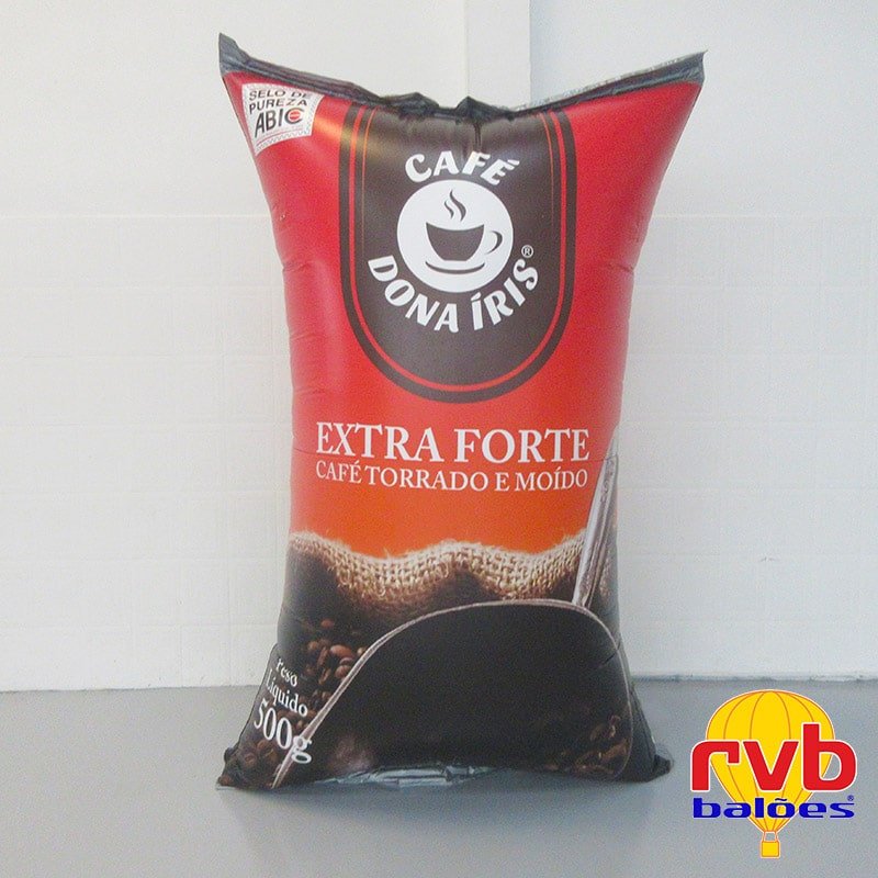 O saco de café inflável é uma réplica promocional em tamanho gigante de um saco de café tradicional, fabricado em material resistente e inflado com ar por meio de um motor elétrico.