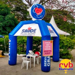 - Tenda inflável: é um inflável no formato de tenda, que é perfeito para ações promocionais e campanhas de saúde na entrada da farmácia ou perfumaria.