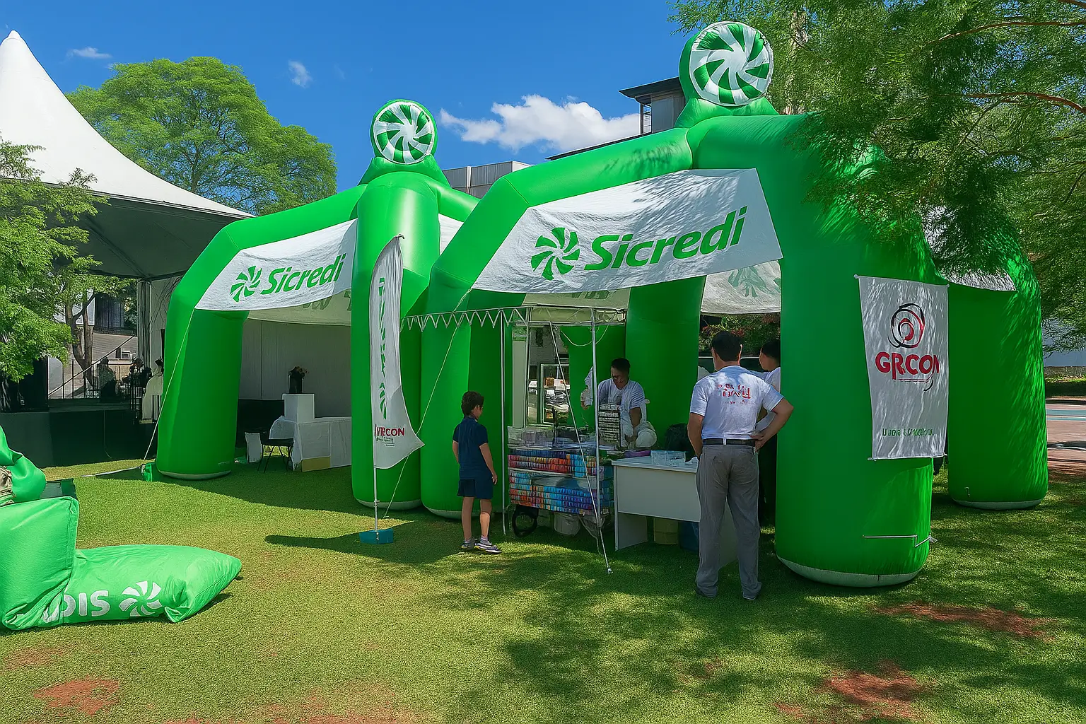 E um ponto importante: em praticamente todas as edições, o Sicredi utiliza tendas infláveis como estruturas centrais de recepção e acolhimento. Essa escolha visual garante padronização, impacto e reforça o vínculo da marca com os valores do cooperativismo.