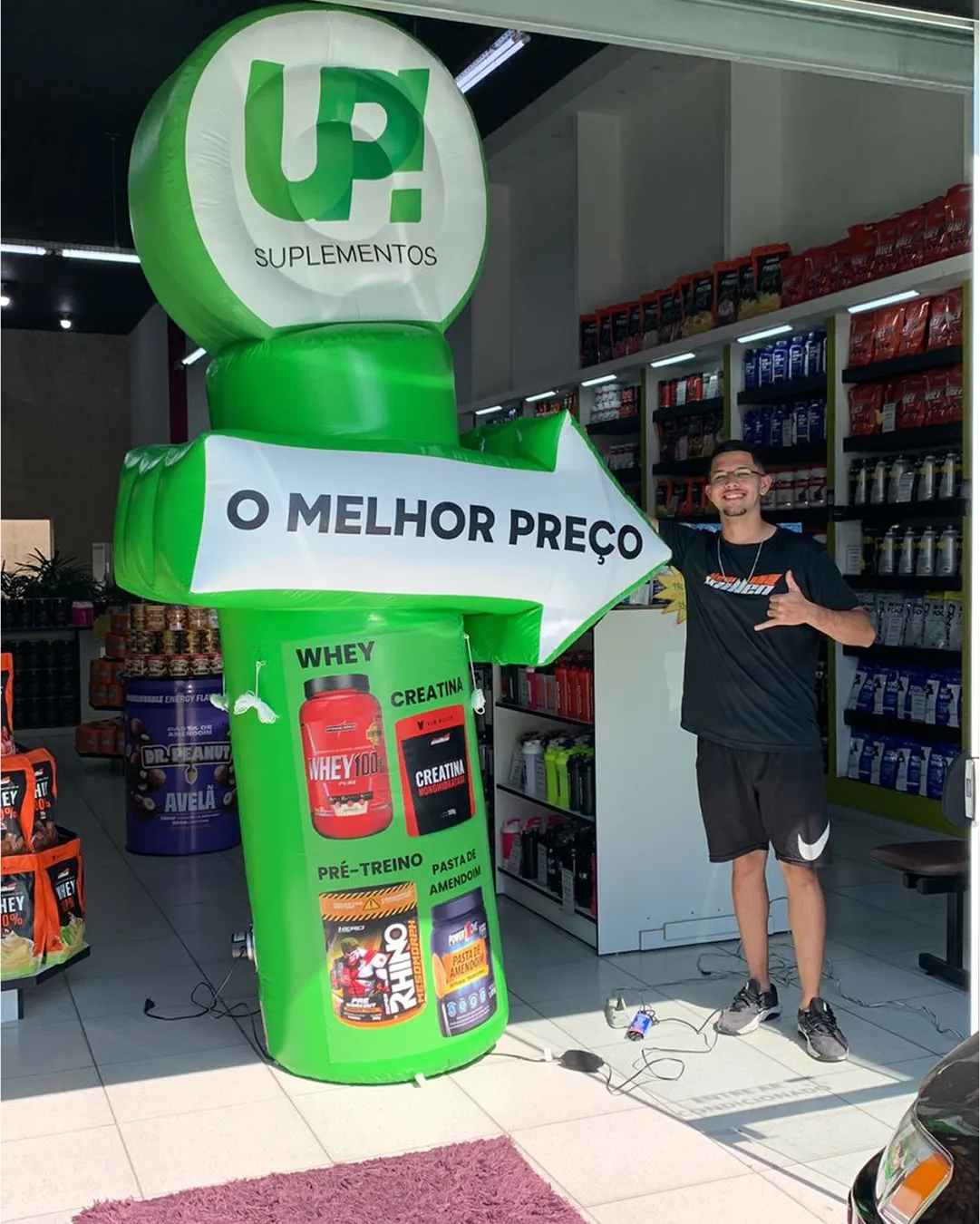 Entre os formatos mais utilizados estão as réplicas infláveis de potes de suplementos, que reproduzem embalagens conhecidas pelo consumidor e facilitam a identificação da loja à distância.